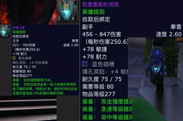 第二件:凯雷塞斯的诱惑。这是一件副手拳套武器,我们先看看它的一个属性,它是2.6的超慢攻速配合着250.6的秒伤,白字属性是78点的敏捷和耐力,随后给了一个蓝色宝石孔,绿字属性则是88点攻强和52点急速以及44点命中,这把武器的属性作为副手的话,小鹿觉得增强萨最为合适,主手在配一个烂肠的拳套,增强萨基本就80级毕业了。