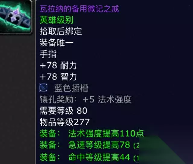 第三件:瓦拉纳的备用徽记之戒。这是一枚法系DPS戒指,它的白字属性是78点的耐力和智力,一个蓝色宝石孔,绿字属性则是110点的巅峰法强和78点的超高急速,以及44点的命中,它比飞升之戒的急速还要高,别看它是命中代替了暴击属性,但是这并不妨碍它是一件极品装备,因为急速流用它补命中绝对是第一选择。