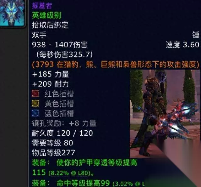 第一件:掘墓者。这是一把命中物理双手锤,我们先来看看它的一个属性,它有着3.6的攻速配合着325.7的秒伤,白字属性是185的高额的力量和一个巅峰的209点耐力,并且还有一黄一蓝一红三个宝石孔的加持,绿字属性则是115点的护甲穿透,以及99点的命中,这件装备最大的亮点就在于115点的护甲穿透。因为已经到了冰冠堡垒阶段,还没有达到1千400加的护甲穿透,你根本不敢谈DPS,而且它还加有99点命中,这可以让你解放很多的命中装备来选择护甲穿透装备,让你更容易的堆满护甲穿透。