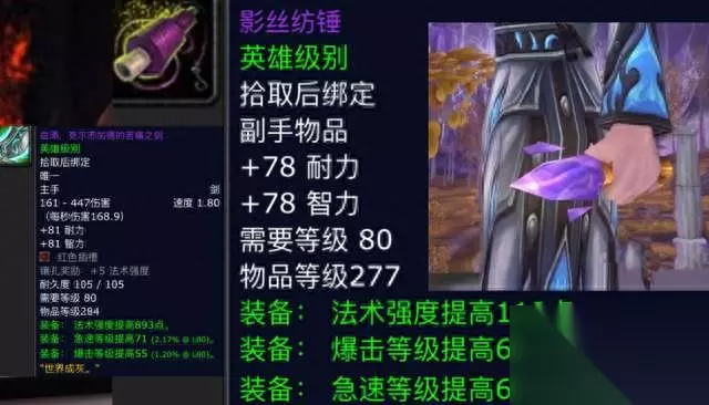 第四件:影丝纺锤。这是一件法系DPS的终极副手,它的白字属性是78点的耐力和智力,唯一的遗憾就是没有宝石孔,但是它的绿字属性还是很给力的,有着119点的巅峰法强和68的暴击以及急速,这件副手装备和巫妖王掉落的血涌克尔苏加德的苦痛之剑配合的话,可以达到1012点法强和123点暴击以及139点急速,毕竟这是光武器带来的属性,对于DPS加成那是实打实的提升,小鹿可以很负责任的跟你说,这一对组合要完全优于80级版本所有的双手法杖。