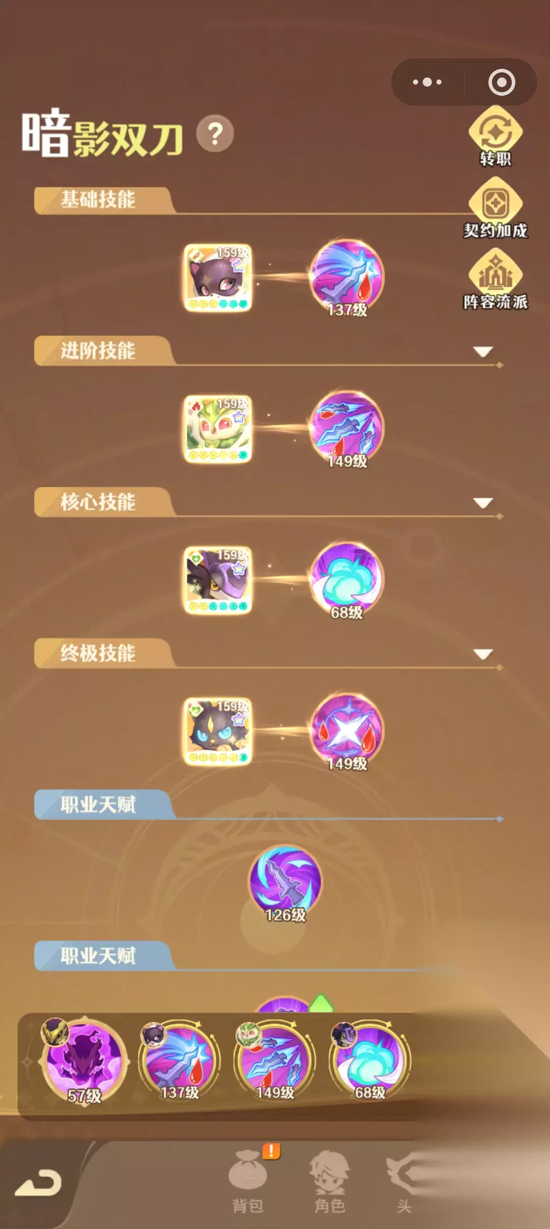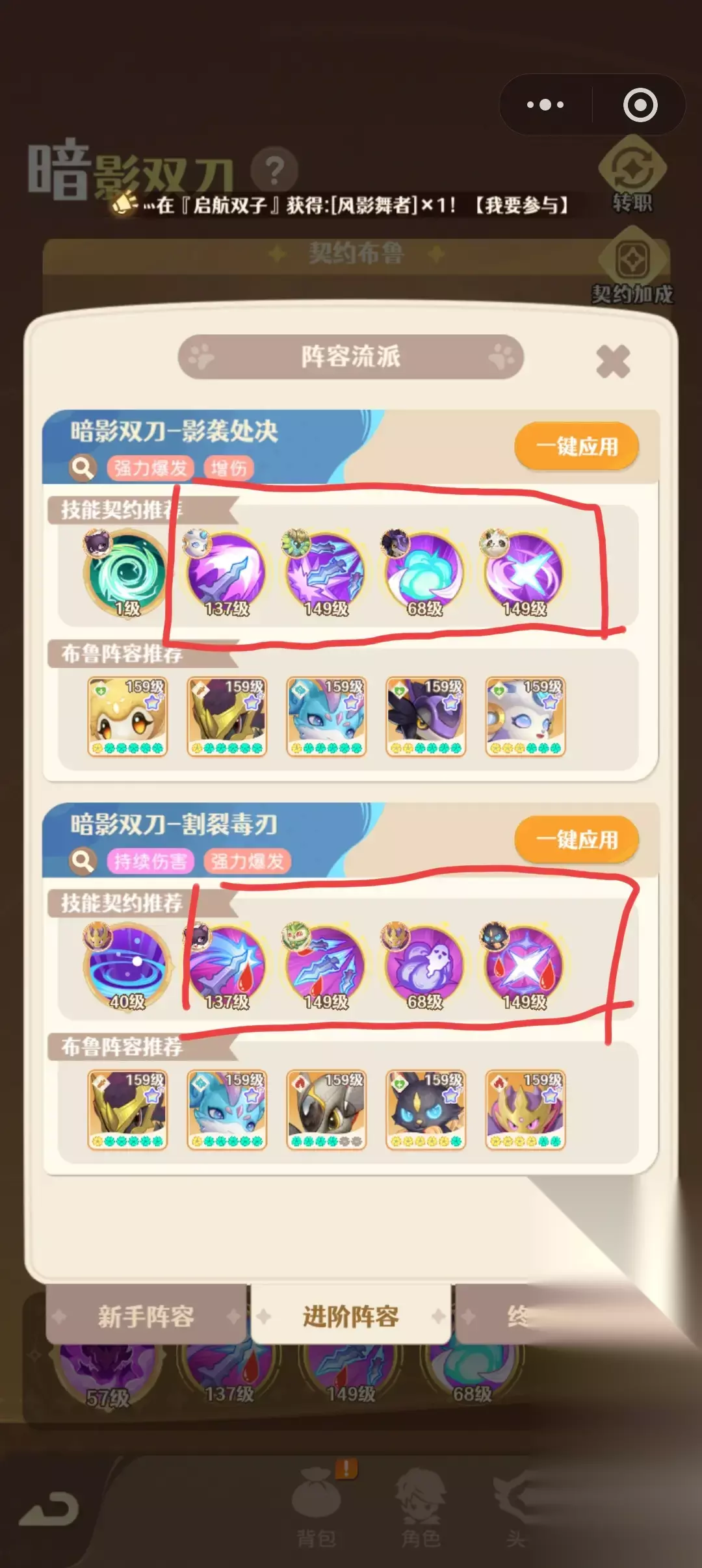 二、契约布鲁: 根据契约不同的布鲁分为两个流派,我用的割裂毒刃,契约布鲁为风系的鸟和风影舞者,暗系的梦魇和暗黑领主,所以前期主要以这几个升星为主,布鲁星高了技能伤害就高; 还有一个可以调和的契约布鲁,以前版本暗龙强所以我契约的暗龙,初始契约为风影舞者和暗黑领主,可以调和成别的布鲁,契约布鲁的词条(布鲁最多6个词条)可以由角色继承,所以词条大多为高级生命,高级攻击,契约布鲁本身的天赋词条,我为了堆攻击力,布鲁的另外三个词条选的特级力量/智力/感应,力量和智力都加攻击力,我也没看出来有什么不同,所以都加上,感应加元素攻击,用来强化布鲁。