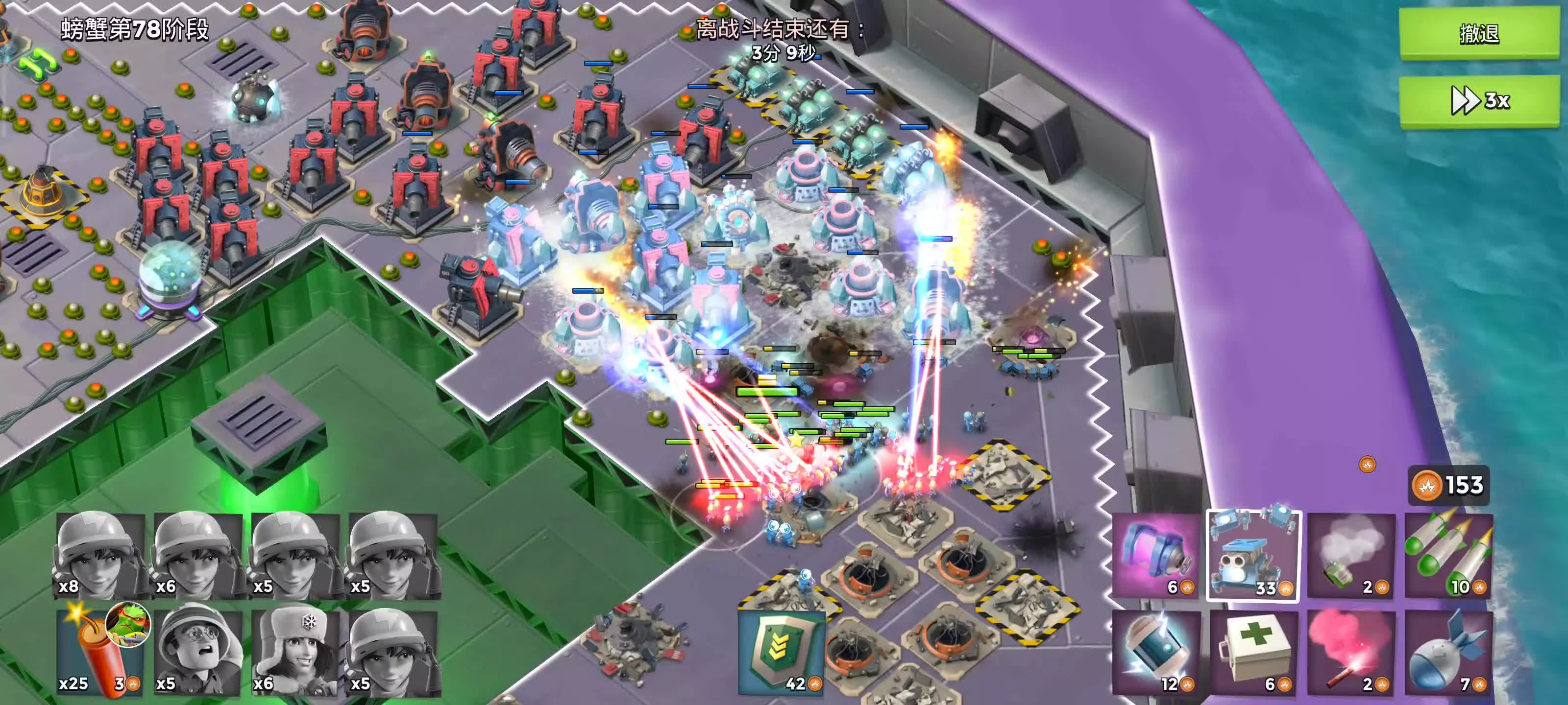 这是《海岛奇兵》母舰87赛季国服新区的游戏内容,玩家采用毒瘤打法冲上14段,距离蓝血段位更近一步,展示了母舰战斗布局与对战过程,还有我方的属性强化加成。
