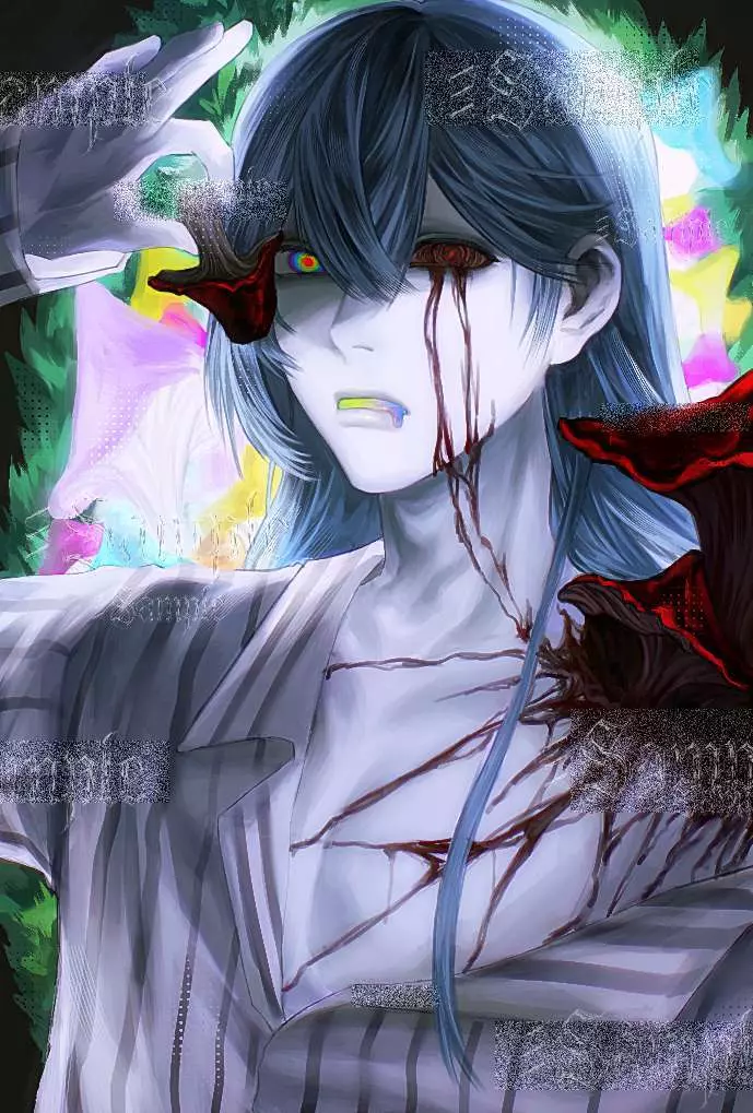 作者分享了一幅暗黑风格的原创手绘插画,画中是有着异色瞳、带有血迹和诡异蘑菇元素的蓝发人物,作者自称画劈叉了,完成后感觉十分疲惫。