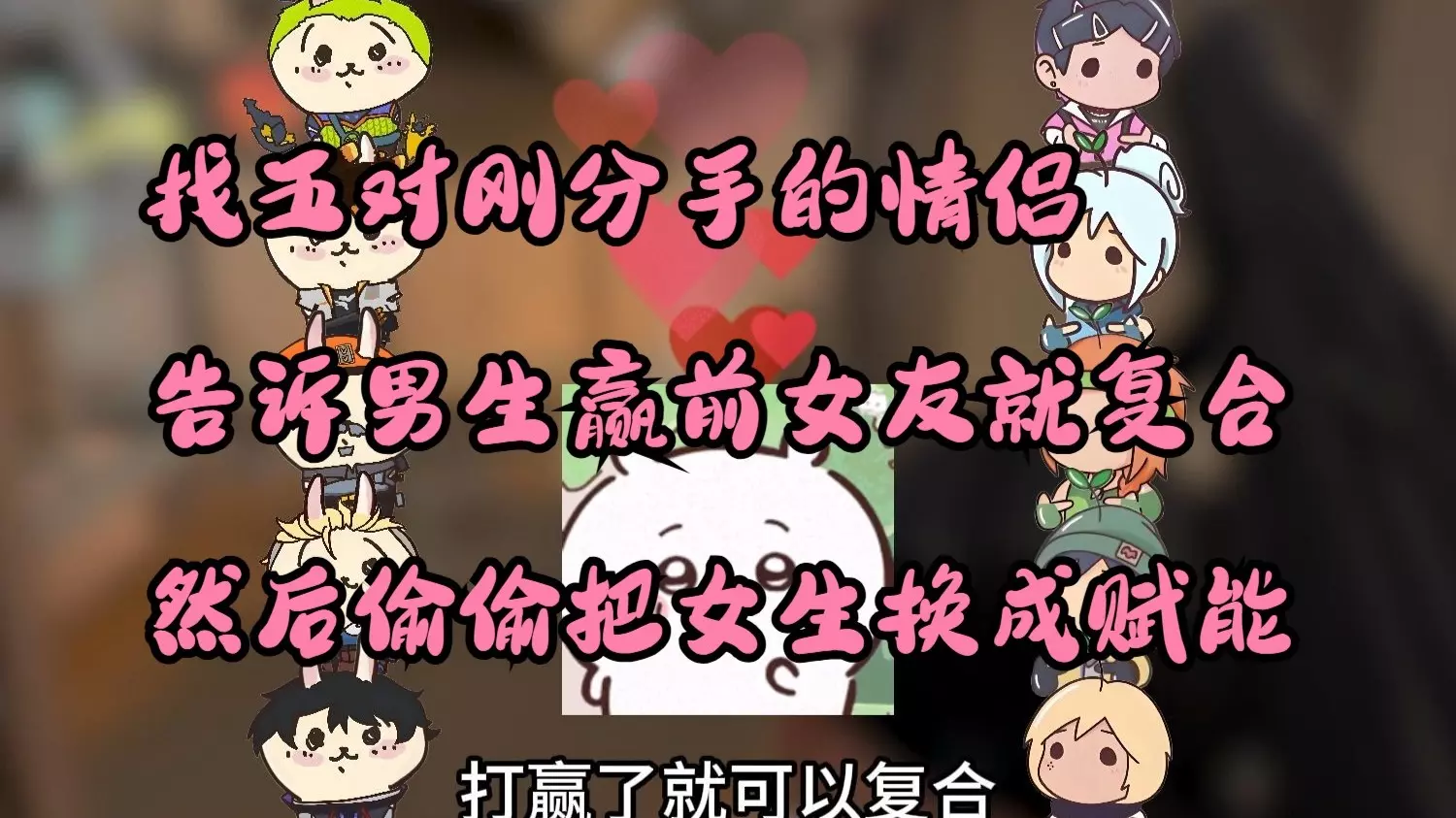 找五对刚分手的情侣 告诉男生打赢前女友就能复合 然后偷偷把女生换成赋能暴打前男友
