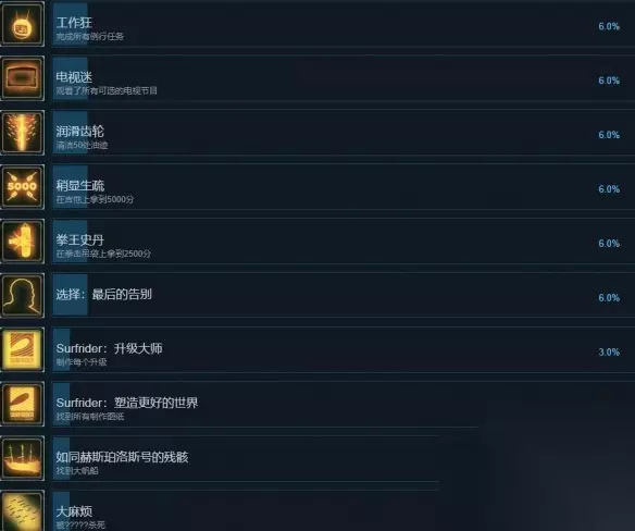 润滑齿轮 达成方法:清洁50处油迹 稍显生疏 达成方法:在吉他上拿到5000分 拳王史丹 达成方法:在拳击吊袋上拿到2500分 Surfrider:升级大师 达成方法:制作每个升级 Surfrider:塑造更好的世界 达成方法:找到所有制作图纸 如同赫斯珀洛斯号的残骸 达成方法:找到大帆船 大麻烦 达成方法:被?????杀死 克苏鲁候汝入梦 达成方法:从残骸中拯救一头乌贼 可持续能源 达成方法:将月亮号的引擎升级为电动引擎