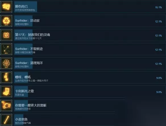 Surfrider:不留痕迹 达成方法:拾取10根空的氧气棒 Surfrider:清理海洋 达成方法:拾取25份塑料 嘿呀,嘿吼 达成方法:让史丹在月亮号上唱一首船夫号子 卡利斯托之歌 达成方法:玩音乐盒 你需要一艘更大的潜艇 达成方法:彻底损坏月亮号 小美男鱼 达成方法:制作25根氧气棒 工作狂 达成方法:完成所有例行任务 电视迷 达成方法:观看了所有可选的电视节目