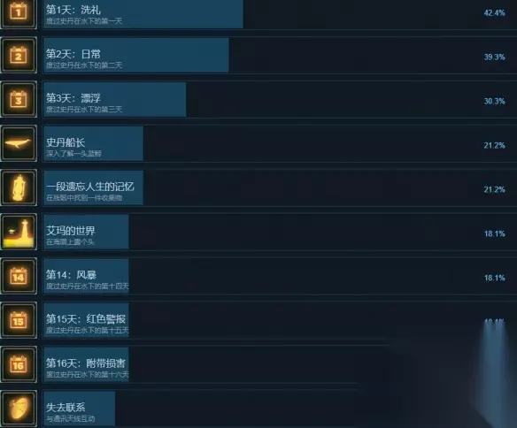 碧波之下中文奖杯列表一览 第1天:洗礼 达成方法:度过史丹在水下的第一天 第2天:日常 达成方法:度过史丹在水下的第二天 第3天:漂浮 达成方法:度过史丹在水下的第三天 史丹船长 达成方法:深入了解一头蓝鲸 一段遗忘人生的记忆 达成方法:在残骸中找到一件收集物