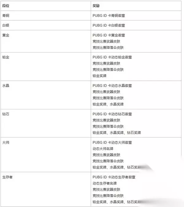 现在竞技比赛中也适用地形破坏。 可用地图:艾伦格、米拉玛、泰戈、荣都 为了提升比赛质量,我们调整了部分地区的竞技比赛模式开放时间。 开放时间(北京时间) 南美(第三人称四排):5:20 - 13:00 东南亚(第三人称双排):19:00 - 1:00 第40赛季奖励 在迎接新赛季的同时,也别忘了查看一下自己在第37赛季中获得的奖励哦!奖励将根据玩家们上赛季取得的最终段位进行发放。
