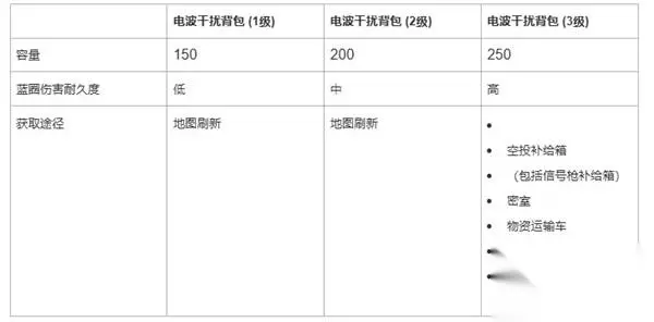 原有的电波干扰背包已更名为电波干扰背包 (2级)。为了配合新的等级系统,更新了原有电波干扰背包的外观。 新增了电波干扰背包 (1级) 和电波干扰背包 (3级)。 目前游戏中的电波干扰背包为1级~3级,且各等级都拥有与之对应等级标准背包相同的容量。 根据背包等级从低到高,可以提供逐级增加的蓝圈伤害吸收。 电波干扰背包 (1级) 和电波干扰背包 (2级) 可以在地图刷新中获得。 电波干扰背包 (3级) 只能通过以下途径获得: 空投补给箱(包括信号枪补给箱) 密室 物资运输车 Lab Camp 补给空投