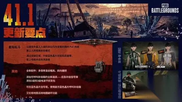 正式服更新日期(北京时间) ※ 具体时间可能会视维护情况而变化。 PC:2026年4月8日08:00 - 16:30 地图轮换 如果您想了解41.1版本各地区地图人气度及地图轮换阵容的相关信息,敬请查阅地图轮换报告 - 41.1! ※ 此公告中提到的各项新功能和更新事项可能会由于 BUG、游戏内问题、玩家社区反馈等原因而被改动或删除。下文中使用的图片拍摄于开发版本,与正式服中的实际样貌可能会有不同,仅供大家参考。 新模式:星际乱斗 《PUBG》的全新模式——星际乱斗即将上线!击退入侵米拉玛的敌人吧! 详情请参阅即将发布的《新模式:星际乱斗》公告。 活动通行证:星际乱斗击退异星入侵!保卫战地、搜集装备,借“活动通行证:星际乱斗”之力击败所有敌人。 场景