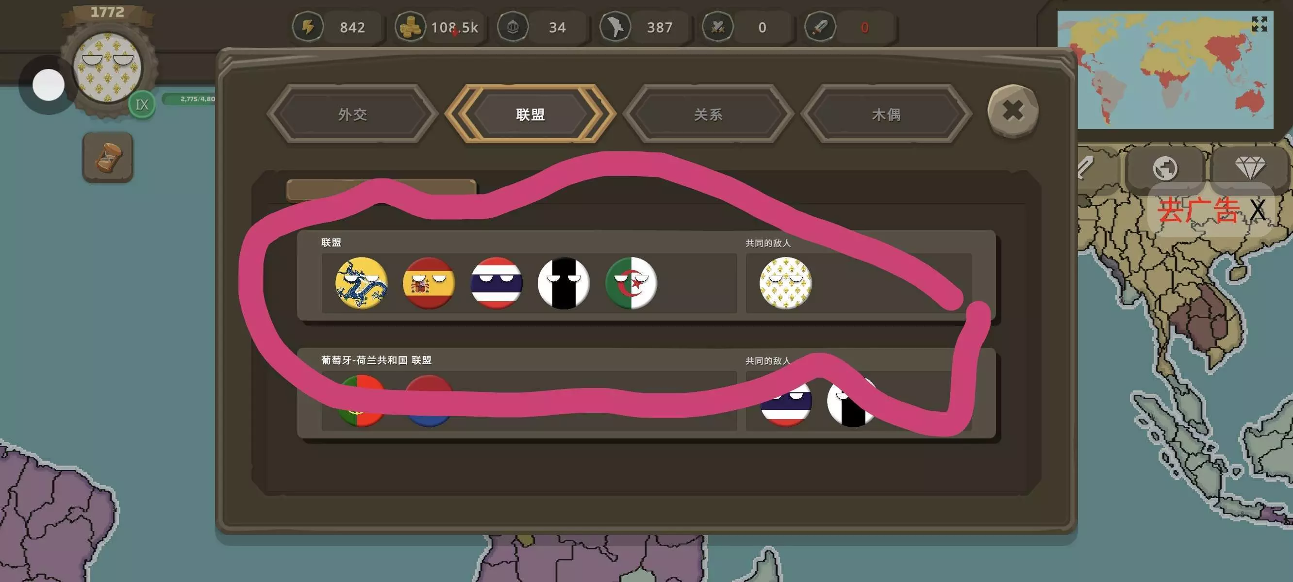 在五个回合前,我帮清朝还了台湾。当时的台湾是英国占领的,我打了英国,把台湾还给了清朝。现在他们还组队来对抗我。