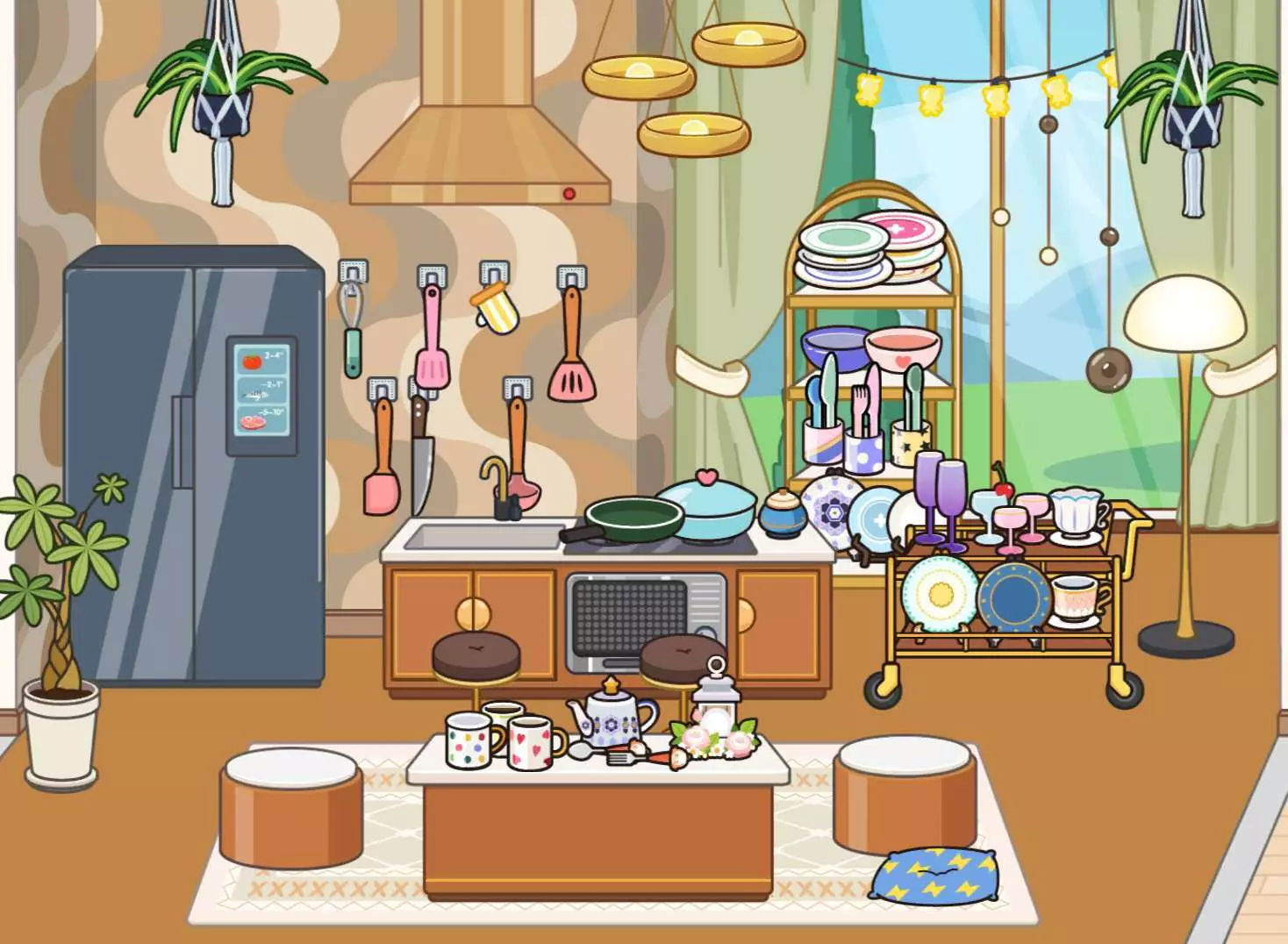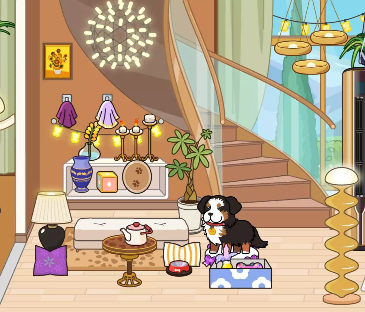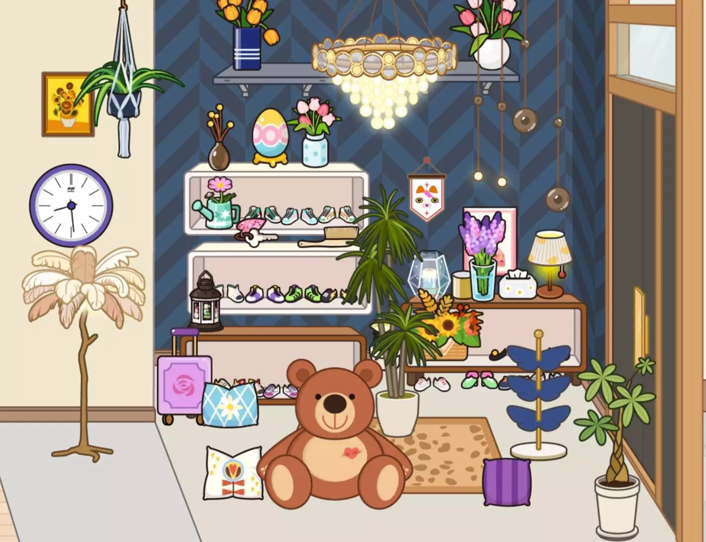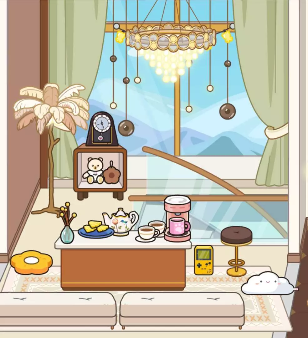 进门是挂满鞋子和鲜花的玄关,暖黄吊灯晕开温柔的光;客厅里,复古沙发挨着满是酒杯的展示柜,落地窗外是永远晴朗的山景;转角的楼梯旁,小狗正趴在玩具箱边晒太阳;厨房里锅碗瓢盆叮当作响,餐桌上摆着刚泡好的热茶;梳妆台前摆满琳琅满目的彩妆,每一件都是取悦自己的小证据;卧室里深灰与暖棕的床品带来安稳睡意,衣帽间挂着待拆的新衣服;浴室的浴缸正放着水,旁边的洗衣区飘着淡淡皂香。