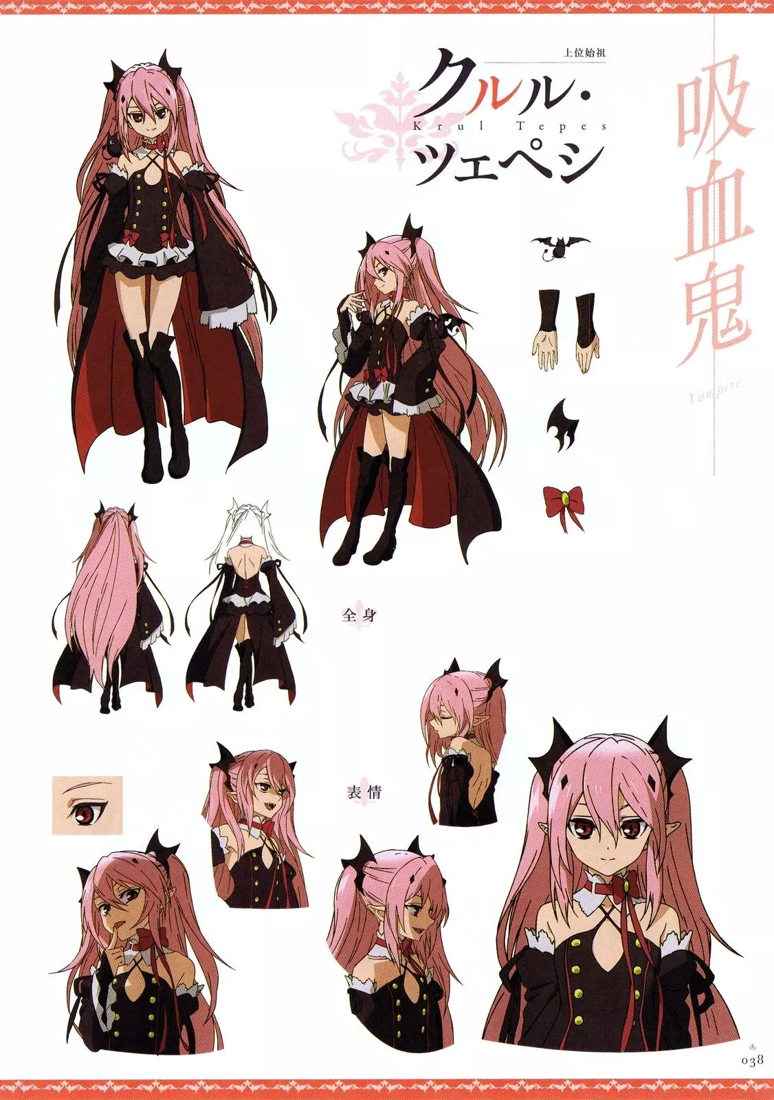 立绘拥有粉色双马尾长发与醒目的赤色双眸。身着哥特风格服饰与高筒靴,身材十分娇小。作为女王,总是会跷着二郎腿坐在王座上,非常有气场。有模仿午睡的爱好。若被激怒会展现出令人与其他吸血鬼都畏惧的恐怖威压。头脑聪慧,行事周密,总能周全考量周遭局势。