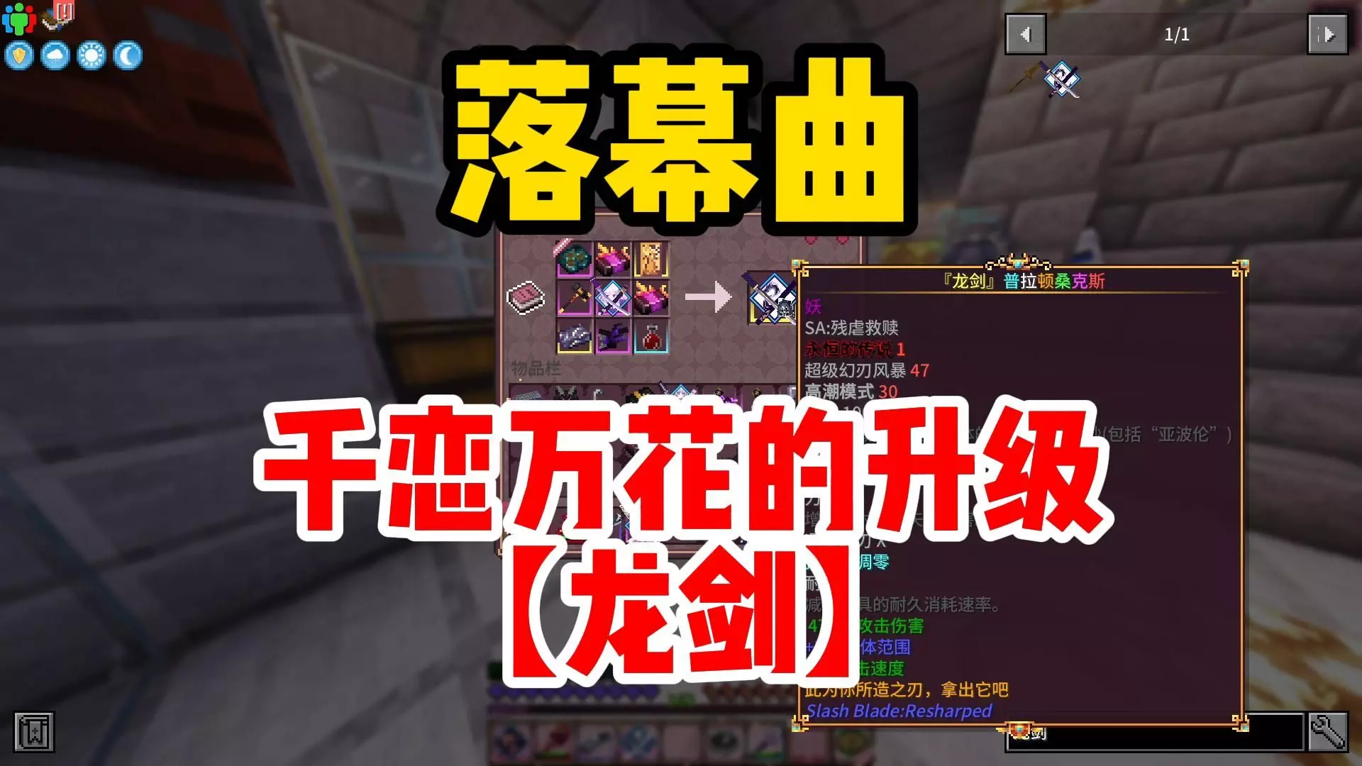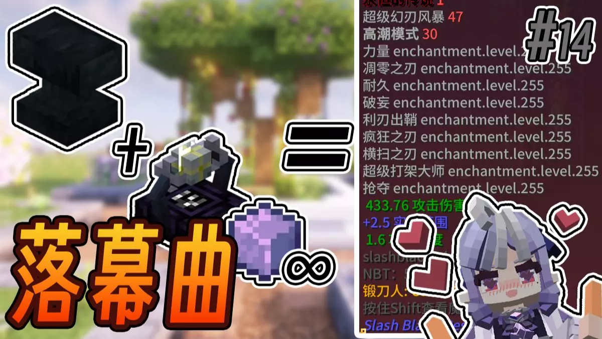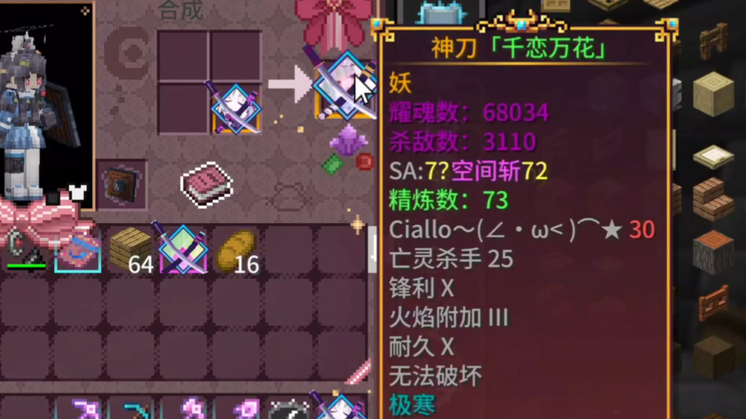 这是结合《千恋万花》的《我的世界》拔刀剑玩法内容,展示了拔刀剑丛雨丸的升级路径,还介绍了获取名刀丛雨丸的等级、击杀数、正面BUFF等条件,以及相关合成配方。