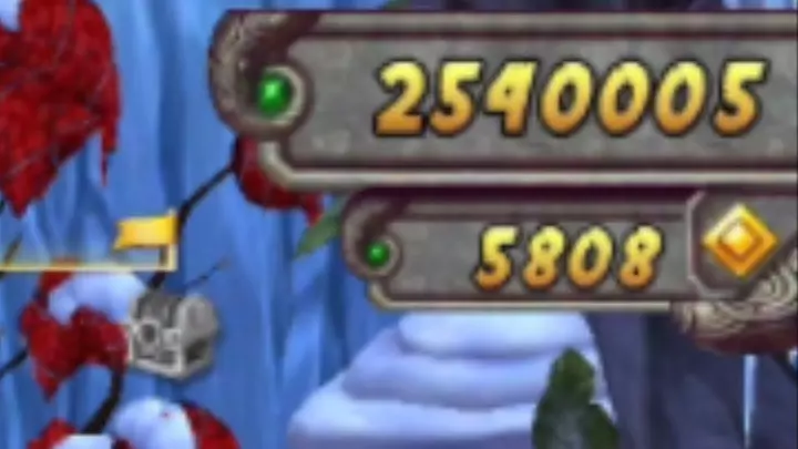 这是跑酷游戏《神庙逃亡2》的冰封暗影关卡内容,展示了玩家操控角色在冰雪覆盖的场景中,借助载具滑行、收集金币,体验特色冰雪跑酷玩法的过程。