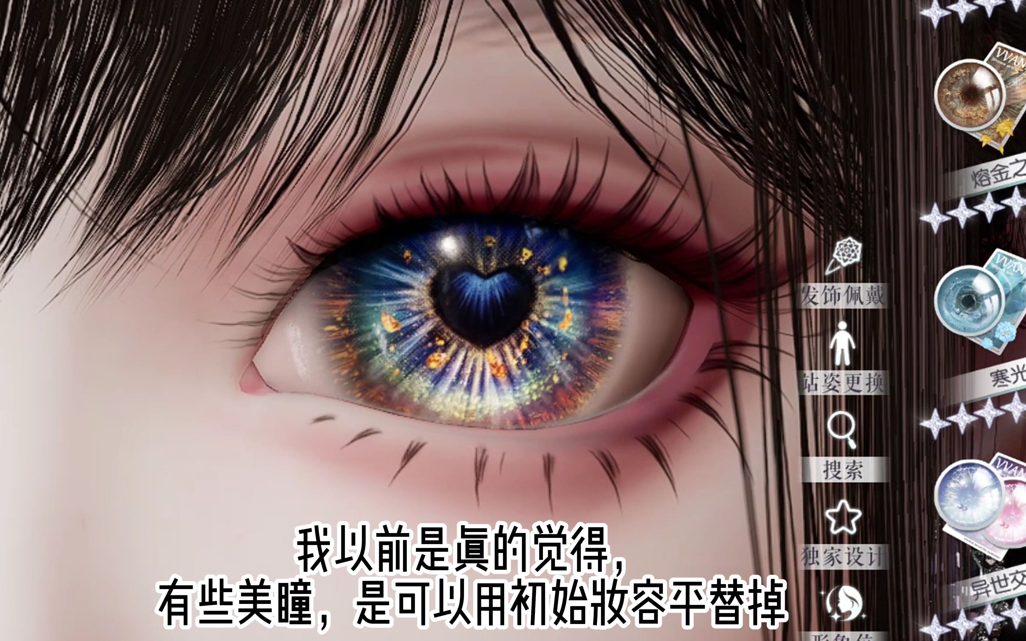 这是游戏《以闪亮之名》的相关内容,作者表示以前觉得部分美瞳可用初始妆容替代,现在发现游戏里的美瞳设计十分精致,像熔金之眼、寒光凝等款式细节丰富,完全无法被替代。