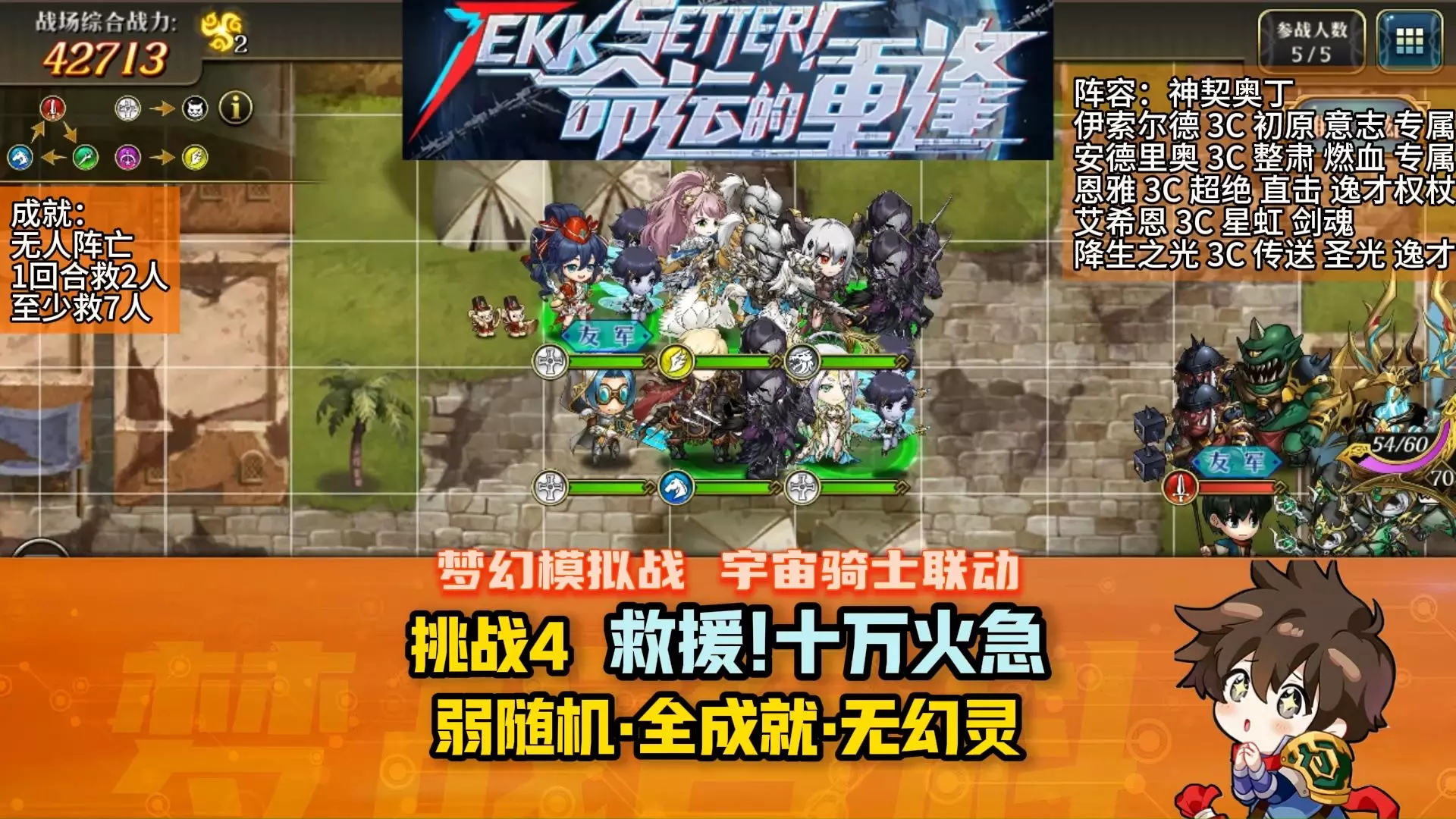 这是《梦幻模拟战手游》宇宙骑士联动挑战关“死斗!魔窟之战”的全NPC攻略,展示了战前英雄阵容搭配、战斗中英雄站位、技能释放等实战操作细节,助力玩家通关该关卡。