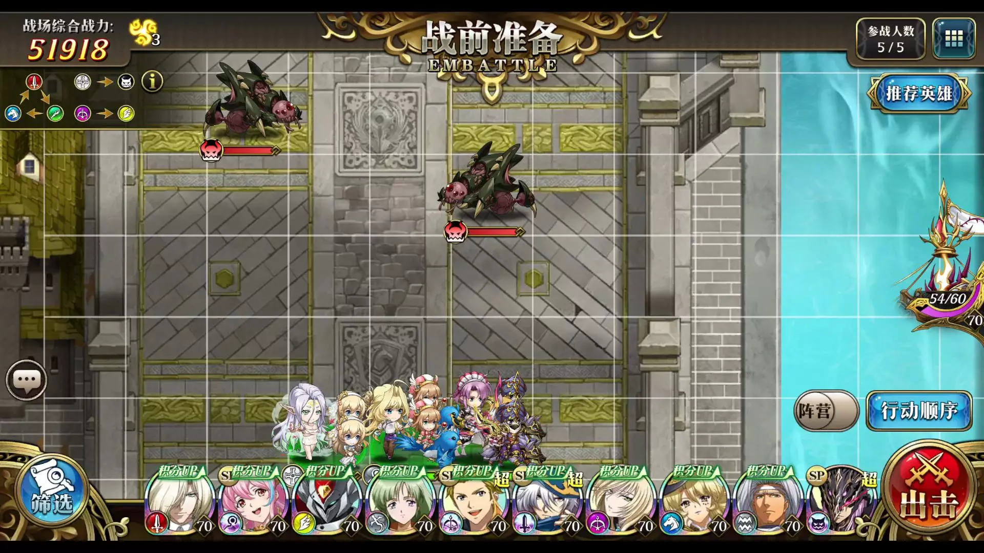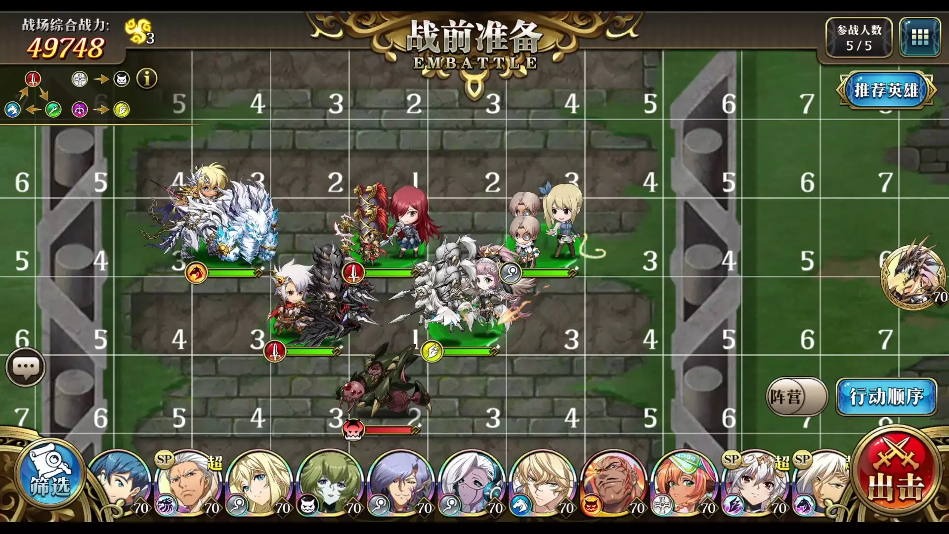 上场阵容 阿雷斯:3C+烈风再起+风语(步兵范围剑带雪莉幻灵) 莉娅娜:3C+再动+治疗 露西:3C+星灵召唤+魔力震荡 其他两个人随便上