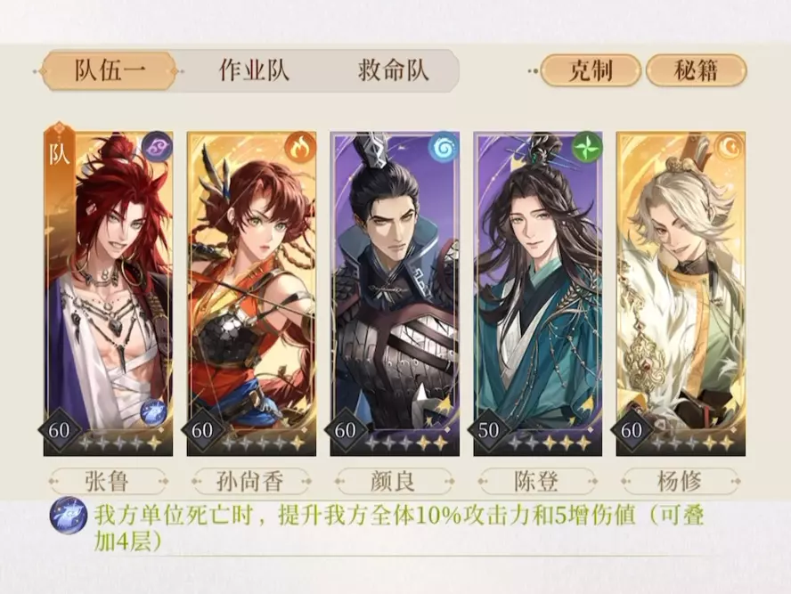 张鲁是打法核心,要洗出伐身害命➕斩灭尸(二星张鲁只洗伐身害命就行) 香香和杨修只要不是克制属性的输出应该都可以