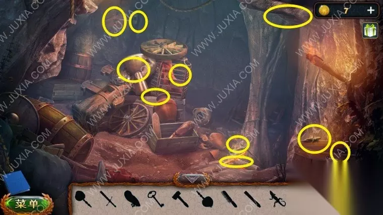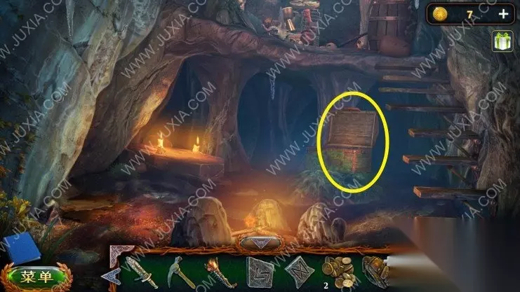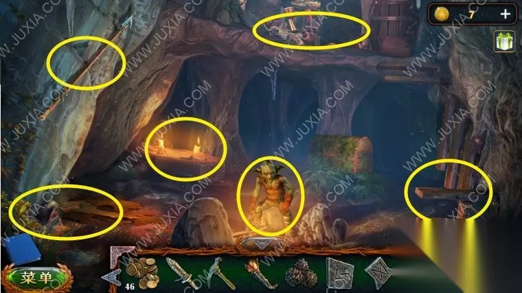 45.用锤子和钉子以及木板组合成一个临时桥,点击洞口,进入山洞中,左边墙上拿到一把戟,左边墙根拿到园艺抹刀,上楼完成二楼的寻物游戏,拿到腰带,把腰带给矮人。45.1 45.2