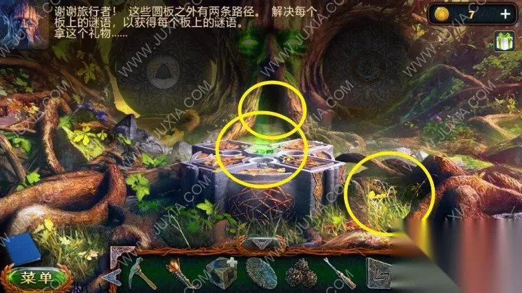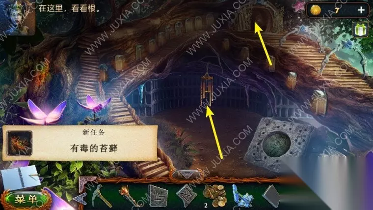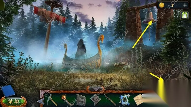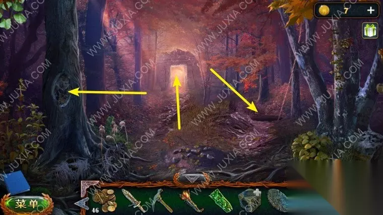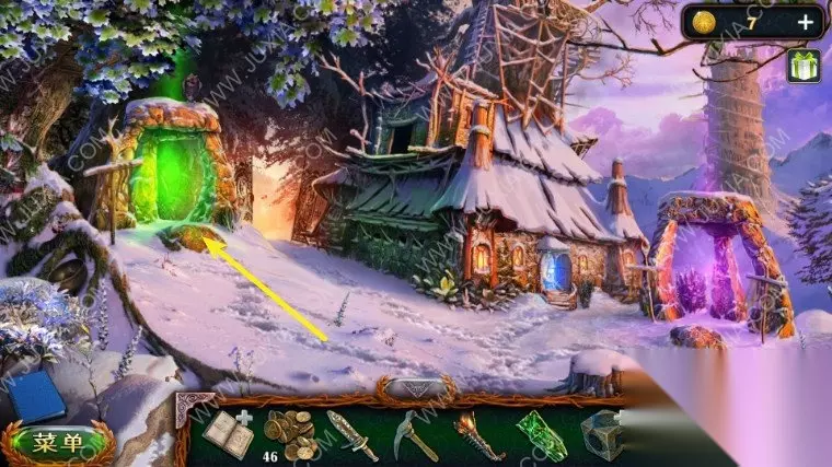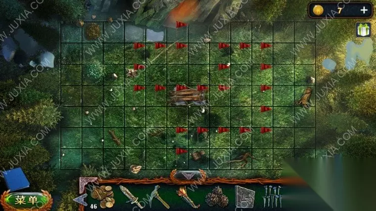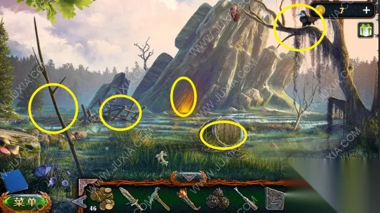 46.回到沼泽中我们点击树上的鸟,向它扔球果,用勾杆拿到大勋章,退回到森林之中,中间的地面我们用园艺抹刀,拿到金币。46.1
