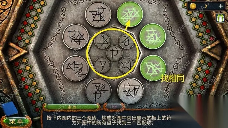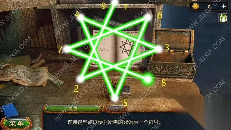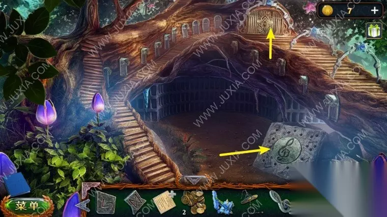 42.打开魔法书,放上马隆的盒子使用启示的咒语,拿到符文石,回到马隆的小屋处,在左边放上符文石,开启黑暗森林,在左边树洞用匕首拿到树果子,再在右边的人手处拿到弩和钥匙的一部分,出陷阱使用弩箭。42.1 42.2