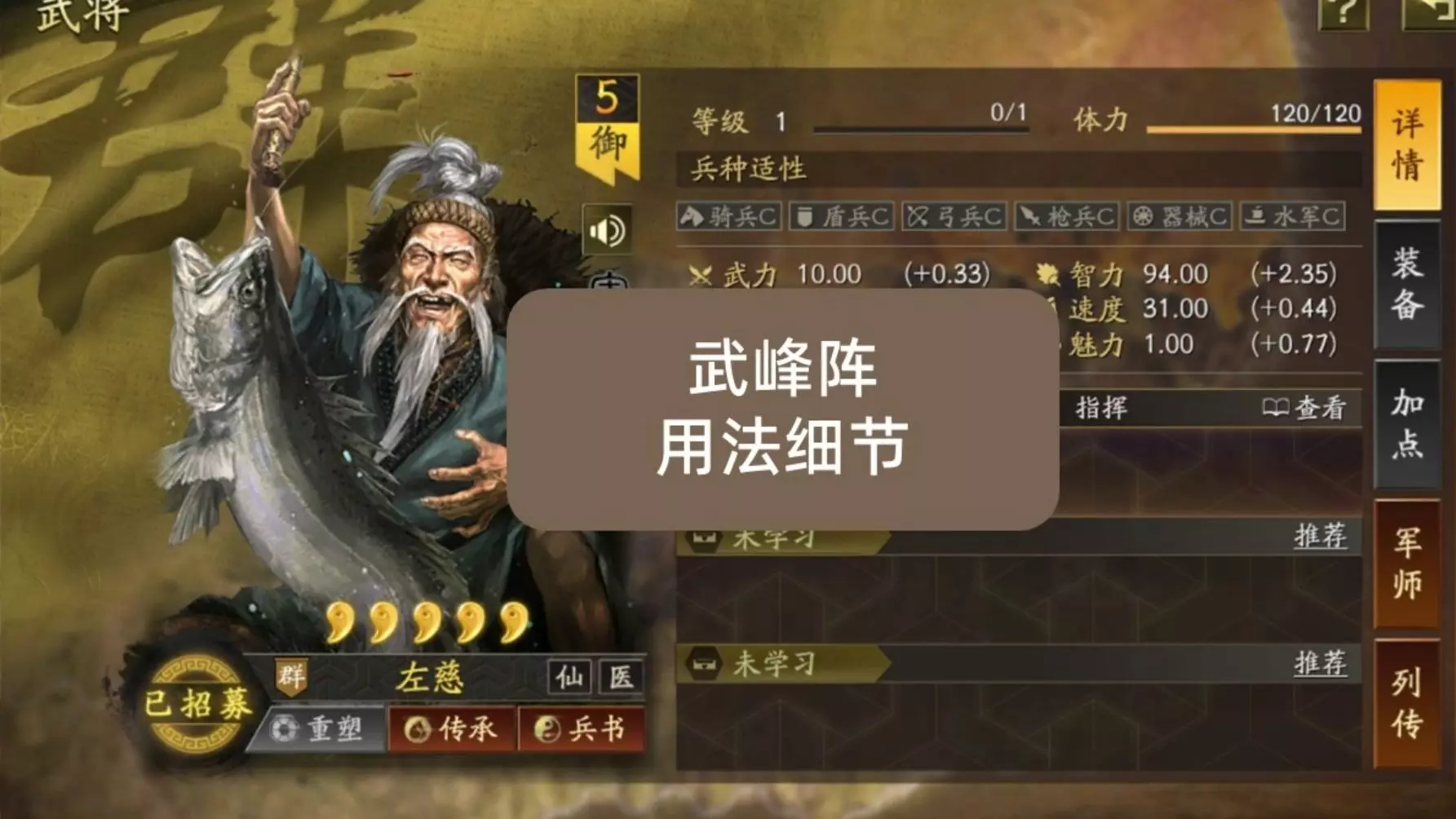 太史慈作为连击型武将,练级推荐携带一骑当千、暴戾无仁等突击战法,搭配虎豹骑或锦帆军提升稳定性,兵书选择一鼓作气+…