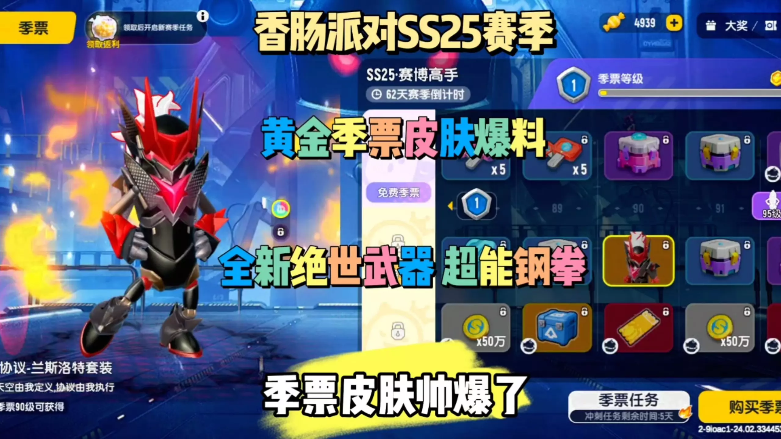 这是手游《香肠派对》SS25“赛博高手”赛季的季票奖励情报,赛季倒计时62天,季票分为免费、经典、摸金三类,奖励包含数据甜心-明湘套装、变形机甲MA-01-赤霄号等外观道具及金币、材料等。