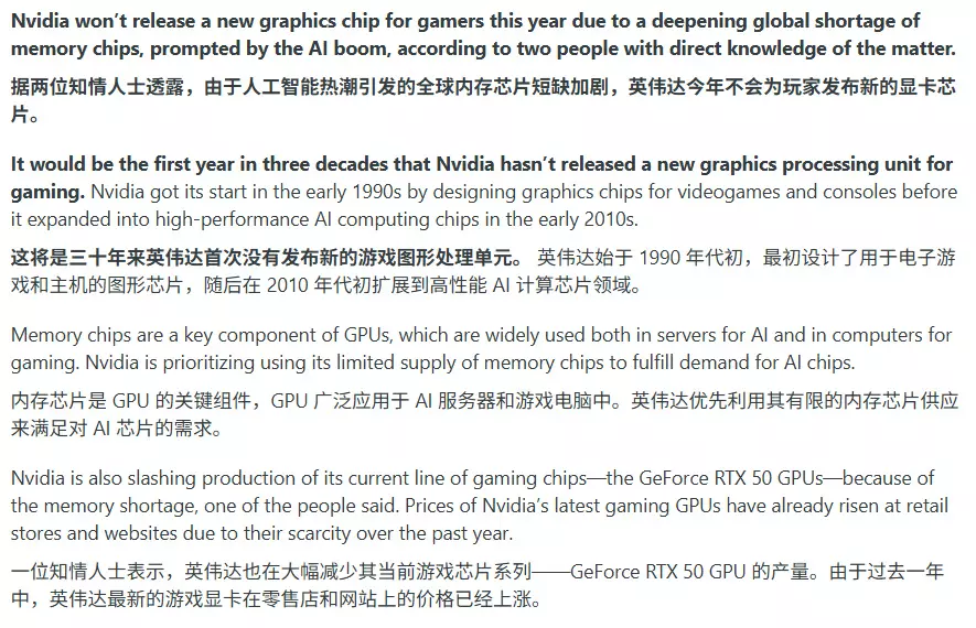 《The Information》报道英伟达今年可能不会发布任何新款RTX 50系列GPU,这意味着RTX 50 Super产品线实际已被推迟。甚至连下一代RTX 60系列型号也遭遇延期。2025年大量传闻曾暗示英伟达将在2026年国际消费电子展上展示其RTX 50 Super产品线。遗憾的是,英伟达几乎没有面向消费者的发布计划,而是将重心完全放在人工智能领域。如果《The Information》的最新报道属实,那么计划在2026年购买新款英伟达GPU的消费者将会感到失望。