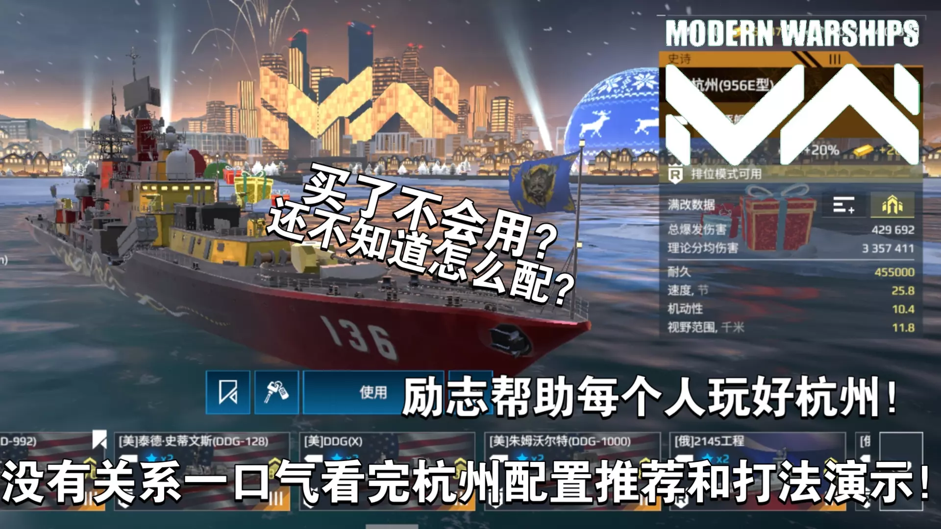 这是一篇《现代战舰》里杭州舰的简评内容,展示了杭州舰的装备配置,如ET40鱼雷发射器、帕克特-NK自动炮等,还提及该舰爆发弱、无强伤的特点,同时给出装备搭配建议,有条件可使用afgs。