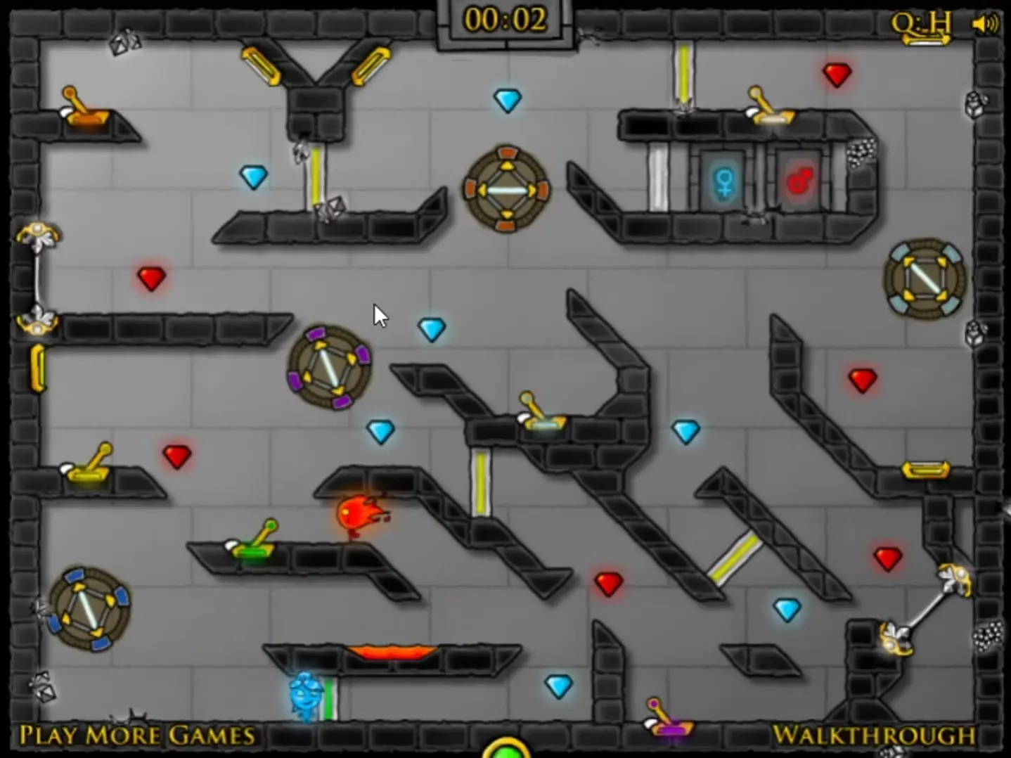 这是一则怀旧游戏内容,展示了单人操作《森林冰火人1》第二十二关,以评分A的成绩速通关卡的过程,呈现了关卡内的机关、宝石收集等操作。