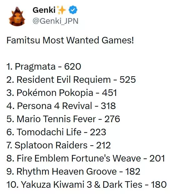 根据最新一期《Fami通》最受期待游戏排行榜显示,《识质存在》已超越《生化危机:安魂曲》成为日本玩家最期待的游戏。这份更新后的榜单由GenkiJPN在X平台公开发布,反映了2026年初多款大作发售前玩家兴趣的显著变化。