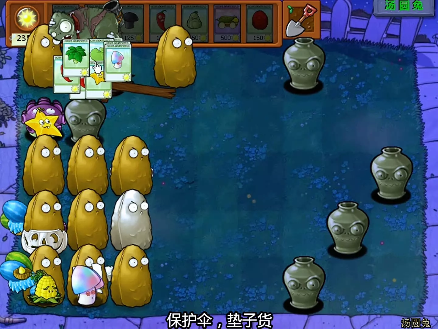这是植物大战僵尸的杂交版进阶砸罐子玩法,画面展示了夜间场景里砸罐后出现各类僵尸,玩家使用寒冰射手等植物对抗僵尸,还有特殊罐子与僵尸,玩法难度为困难,需合理布局植物来通关。