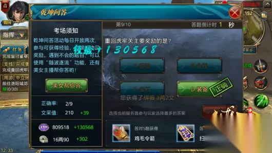 乾坤问答活动奖励 乾坤问答活动奖励文采值、经验、绑银、鸡毛令箭和答题宝箱,获得的经验值非常多,70级的玩家们每答对一道题,就会奖励29万8千的经验,答错也有一半的经验奖励,10道题全对就会有接近300万的经验奖励。如果对自己的答题不是很自信,又不想放弃高额的经验奖励,建议不做答题活动,等到第二天的时候拥绑金完美找回全额经验。答对5道题就会获得一个鸡毛令箭,答对10道题就会获得答题礼包,答题礼包打开后会获得鸡毛令箭及扫荡令,鸡毛令箭是用来在“鸡毛信”任务换取鸡毛信的道具,扫荡令可以直接扫荡完成副本。 乾坤问答活动中出现的题目很多,有些题目很有趣味性,也非常具有挑战性,学霸们大显身手的机会到了。