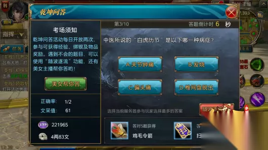 乾坤问答活动介绍 乾坤问答是一个趣味答题类型的活动玩法,每天中午12点15分开启,13点活动关闭,玩家参与乾坤问答答题,可以获得经验、绑银以及积分奖励。如果遇到不会的题目,可以向家族成员求助,共有3次求助机会。如果错过了答题时间,可以在第二天的经验找回里面找回答题经验。 乾坤问答答题准备 每天中午12点15分的时候,系统会准时弹出对话框“答题活动已经开启,是否前往?”,玩家们点击确定直接进入答题,如果当时有其它任务在身,就可以暂时取消答题,在12点15分到13点的答题时间内,再从”活动-日常“进入答题页面。