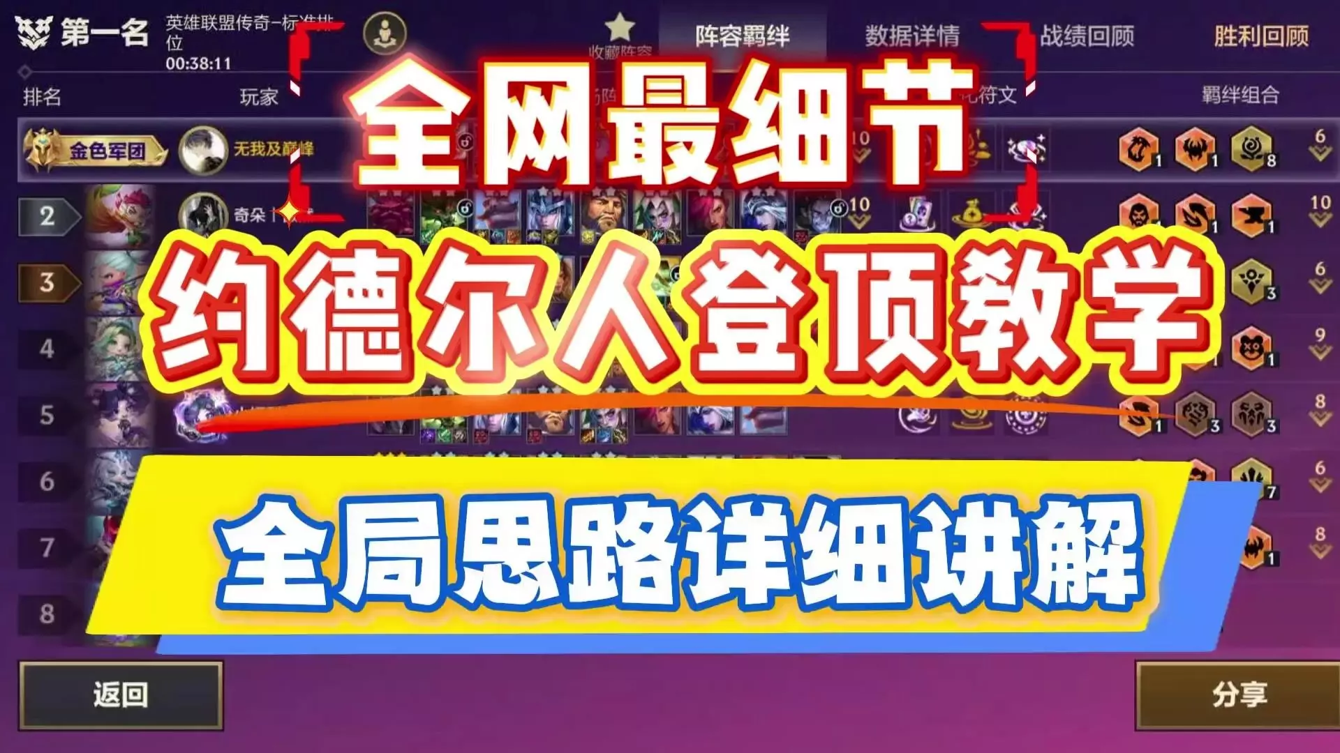 这是一篇金铲铲之战的约德尔人登顶教学帖,带来全网最细节的约德尔崔丝塔娜阵容玩法,包含前期过渡、装备分配、搜牌节奏等全局思路讲解,助力玩家使用该阵容上分登顶。