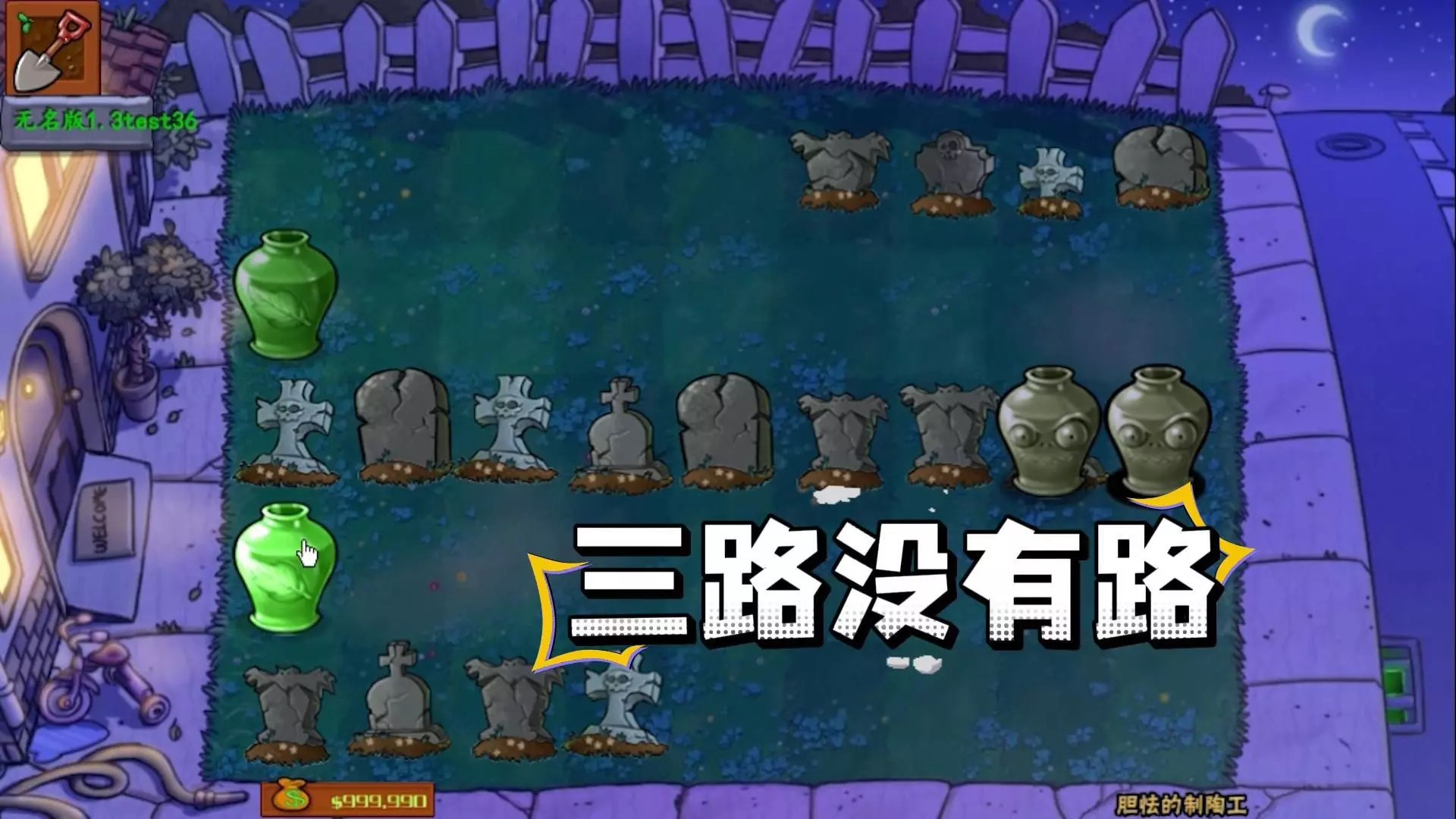 这是单机游戏《植物大战僵尸》无名版1.3test36的砸罐玩法内容,开局有狙击手植物和猫型植物组成“击猫组合”,但面临僵尸包围的处境,玩家通过砸罐获取植物、使用爆炸类道具等方式应对僵尸。