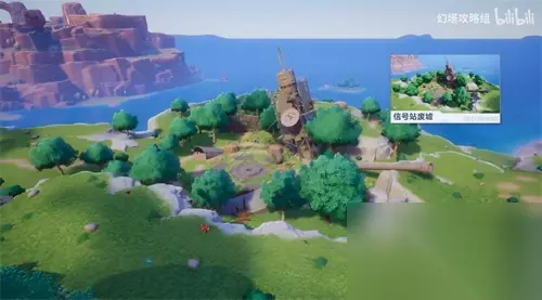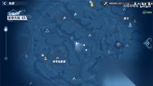 传送到“班吉斯原能塔”,如下图从塔上向西南方向飞去,会看到一些铁板围成一个半圈形状,在山崖边上就是“信号塔废墟”风景点。