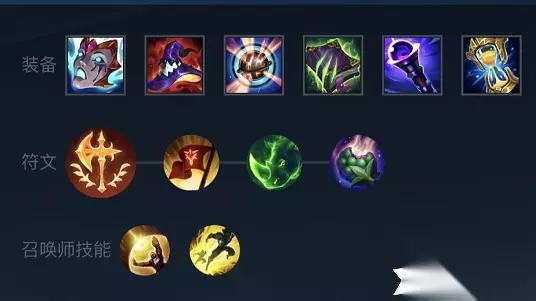 4.出装讲解: 装备上我们首选小面具,性价比最高的装备,提高生命值同时提高法强,还有优秀的被动,第二件大帽子,自身伤害可以最大化。鞋子除了看阵容外,需要频繁游走且对面控制不多时可以出三速鞋,之后鞋子合称为金身为团战保命,也可以在合适时机换成传送支援队友,后续装备为无限宝珠、法穿棒、鬼书,这套装备性价比最高。 出装推荐二:团战收割流 1.装备:无限法球+贪婪之靴+灭世者之帽+虚空之杖+守护天使+海克斯科技枪刃 2.符文:征服者+猎人吸血+猎人泰坦+甜食专家 3.召唤师技能:闪现+屏障