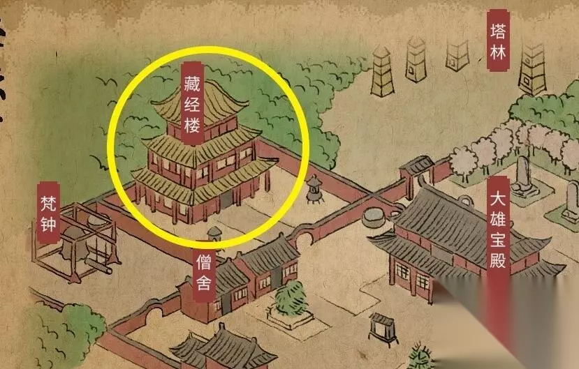 4、前往藏经楼,拿去一至三层的所有经书,二楼有一个书柜需要玩家多次翻找,直到获得经书。