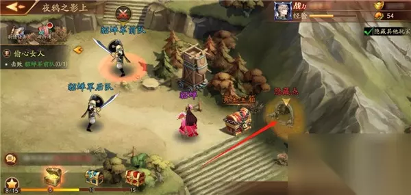 第二十四章:夜鸦之影 本章隐藏点为线索事件,需要先拿到线索才能触发,线索位于地图上方的山脚下,拾取散落的纸页,根据指示来到地图左下方貂蝉右侧石阶旁的山脉,即可触发隐藏点
