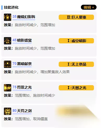2. 关键技能进化 35级【魔镜幻影阵】 → 加点:巨人要塞范围增加,镜阵攻击-1 45级【毁灭者】 → 加点:虚空暗影单次攻击,地面/空中可释放 70级【死亡祭礼】 → 加点:无上祭品聚集敌人并可移动魔法阵 75级【罚罪之光】 → 加点:天怒之光能量炮+4,最多消耗10灵魂 80级【天罚之剑】 → 加点:暗影处决取消僵直,空中可使用 3. 技能强化建议