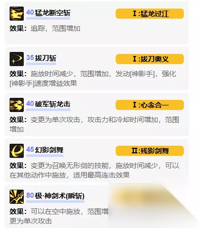 2. 核心技能进化 35级【拔刀斩】 → 拔刀奥义CD减少,范围增加,附加攻速/移速增益 40级【破军斩龙击】 → 心念合一单次高伤害,范围/浮空力提升 40级【猛龙断空斩】 → 猛龙过江追踪敌人,攻击范围扩展 45级【幻影剑舞】 → 残影剑舞召唤无形剑,斩击速度提升 80级【极·神剑术(瞬斩)】 → 一剑断罪闪空中可用,范围扩大 3. 推荐强化顺序 极·神剑术(破空斩):提升爆发伤害 极·神剑术(瞬斩):增强机动性 破军斩龙击:优化连招衔接 小贴士:优先完成主线任务获取加点资源,根据实际战斗场景灵活调整加点顺序。 ©