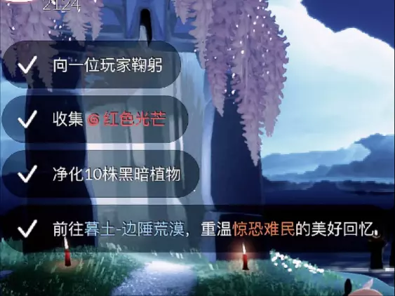 这是光遇4月7日的每日任务攻略,包含向玩家鞠躬、收集红色光芒、净化黑暗植物、在暮土边陲荒漠重温惊恐难民先祖回忆这些任务,还展示了暮土里季节蜡烛的位置,助力玩家完成光遇每日任务。