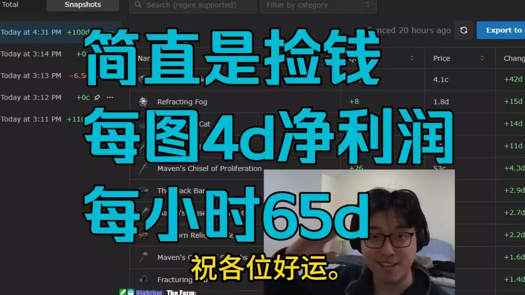 path of evening 带来的精华策略。核心思路是:通过特定圣甲虫(升格、稳定、钙化、应变、强敌)和异界天赋,最大化每张地图的精华怪数量,并腐化所有精华怪以获取高价值的腐化精华(谵妄、浮夸、极恐、错乱)。推荐地图包括晴空幽岛、剧毒林谷、没落圣所等。收益非常稳定,平均每张图1神圣以上。 不要点“水晶共振”天赋,会破坏腐化机制。 相比于之前的bawloch的精华策略,主要是将一个强敌换成了应变,这个甲虫效果:释放区域内被禁锢的怪物会使区域内的另一个被禁锢的怪物获得一个随机精华词缀 区域内被禁锢的怪物每有一个精华词缀 难度和奖励都会提高。提高了收益也增加了难度。不过evening是陆续刷的,所以并没有小时收益。赛季末期了,当作是一个策略的统计吧。