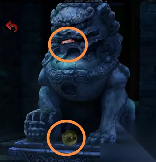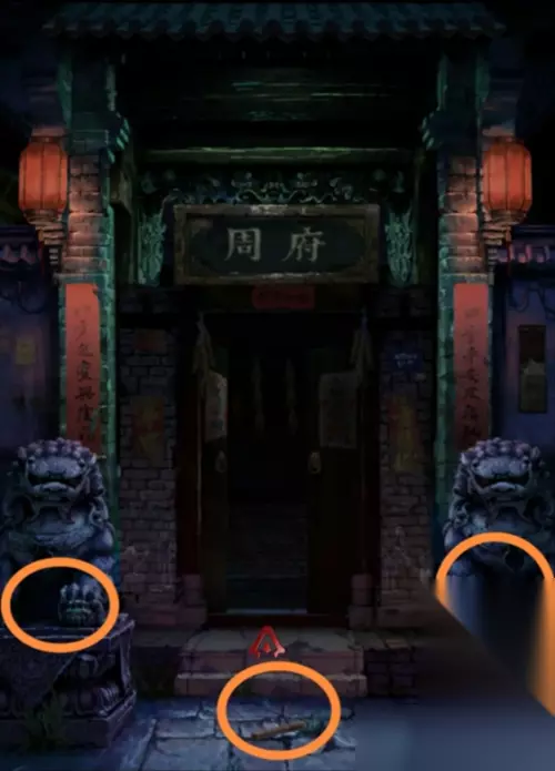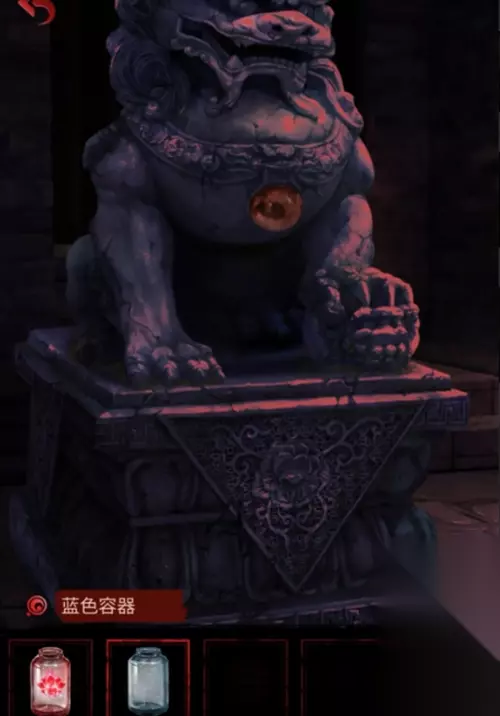 将红珠子放到周府门口左边石狮子身上,狮嘴吐出水流,获得蓝色容器。