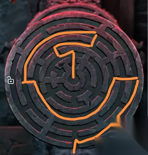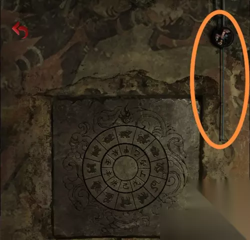 回到立炉子的场景,看到正中间台子上的信,来到墙上圆盘,移动图案,点击中间圆圈,墙壁凹了进去。