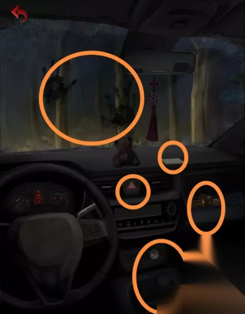 车里显示前方太黑看不清,打开车灯,车挡风玻璃留下一双手印,小熊摆饰旁边是一张女孩照片,把车里放的电池拿走。
