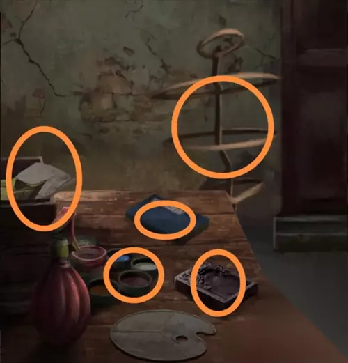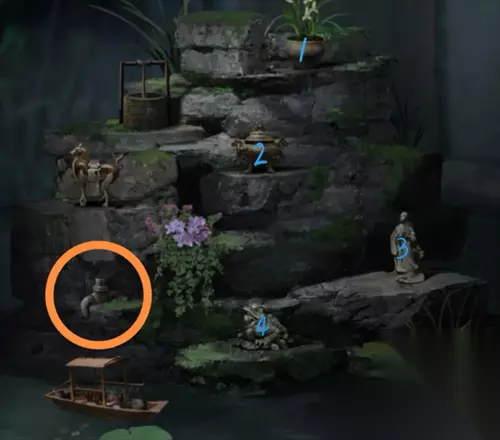 进入工作室,对于门口旁柜子上的锁 ,根据水从上往下的顺序,离水近的4个物品,分别是花,炉子、人和蛙(可看上图)。