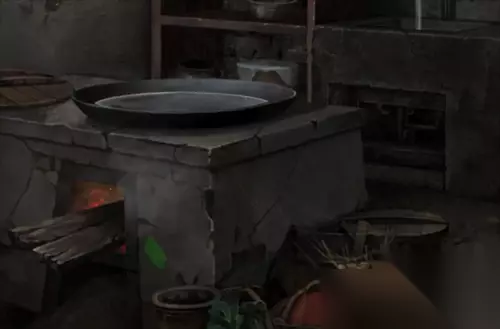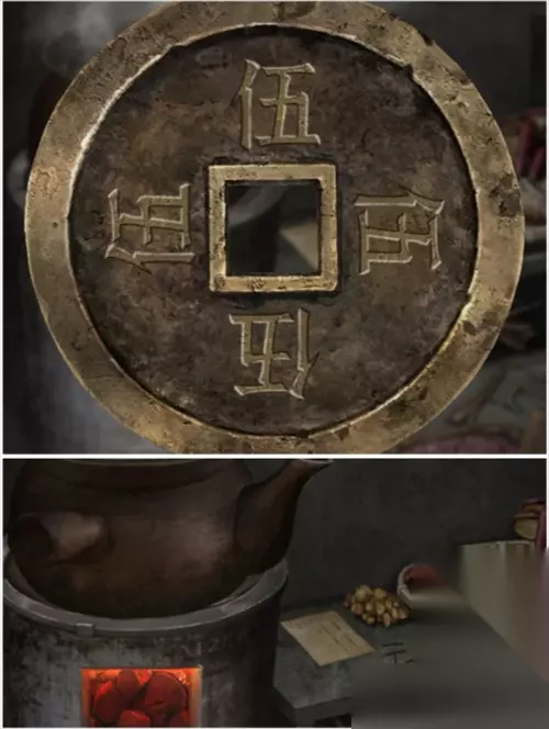 绿意场景厨房火炉旁边凳子上的符号,用铜钱显示是伍